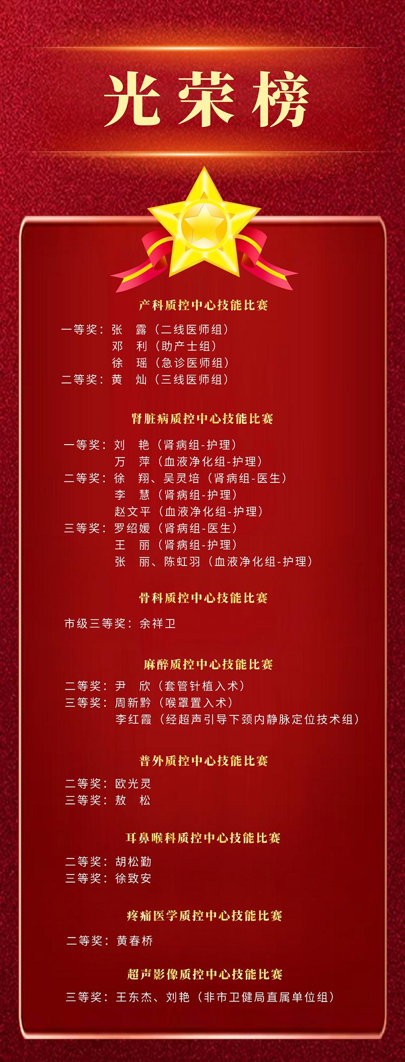 为进一步提升医护队伍专业技能水平和专业服务能力,激励广大医务工作者爱岗敬业、奋发向上,加快培养医学领域优秀人才,为全市更高水平的医疗健康服务提供坚强的人才保障,由市卫生健康局主办、贵阳市医疗质量控制中心承办、各市级医院协办的2022年贵阳市质控中心技能竞赛圆满结束。贵州医科大学附属白云医院张露、刘艳、余祥卫等25名参赛选手在产科质控中心、肾脏病质控中心、骨科质控中心等8个医疗专业技能比赛中荣获嘉奖,祝贺他们取得了优异成绩!