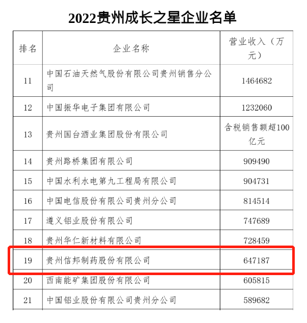 12月16日,贵州省企业联合会、贵州省企业家协会在贵阳发布《2022贵州百强企业榜单》及《企业发展报告》。信邦集团连获殊荣,荣登2022年度贵州百强企业、贵州百强制造业,以及贵州成长之星企业榜单,持续领跑贵州医药行业。