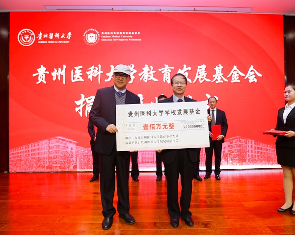 在12月21日举行的贵州医科大学教育发展基金会揭牌仪式上,信邦集团旗下贵州医科大学附属肿瘤医院、贵州医科大学附属白云医院、贵州医科大学附属乌当医院参加仪式。肿瘤医院院长罗开俭、白云医院院长曾庆繁、乌当医院院长毛大华分别代表医院向教育基金会各捐赠100万元教育基金。